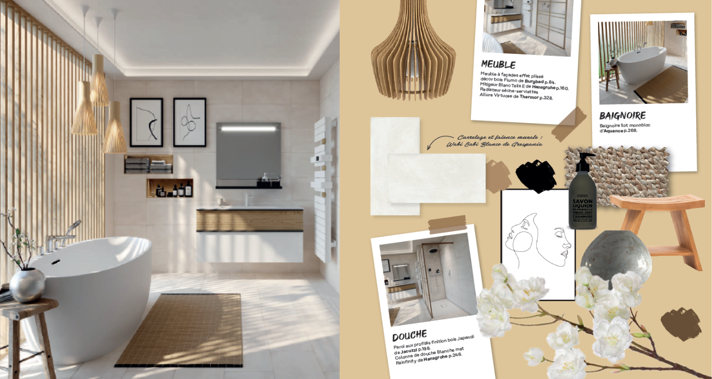 Cette année, les ambiances des différentes salles de bains sont appuyées par des planches colorées détaillées et des mises en scène plus réalistes. Les « moodboards » (planches d’ambiance) vont permettre aux clients de se projeter de façon plus concrète avant de venir en magasin pour être accompagnés par les experts Grandbains.